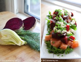 Root veggies like beets and fennel taste fantastic. I like to roast them and I know some like to add the raw fennel fronds to salad. One of my favorite salads is arugula, roasted beets, grapefruit, chevre, and another favorite topping: fresh mint. Top with a simple vinaigrette and it's a salad that is flavorful and filling. In the summer, add pine nuts and swap out the grapefruit for watermelon. Salads like these keep me out of the maternity-wear stores... although those elastic-waistbands are still extremely tempting.